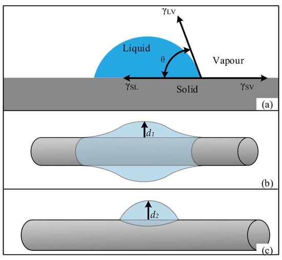 The contact angle can intuitively reflect the degree of infiltration of a certain liquid into a solid. When liquid droplets of different viscosity are added to the solid surface, the droplets will form different shapes due to the difference in infiltration. As shown in Figure 8a, the angle between the vapor–liquid connection line and the solid–liquid connection line is called the contact angle, which is usually represented by θ. The contact angle of the droplet on an ideal smooth surface can be expressed by Young’s equation: