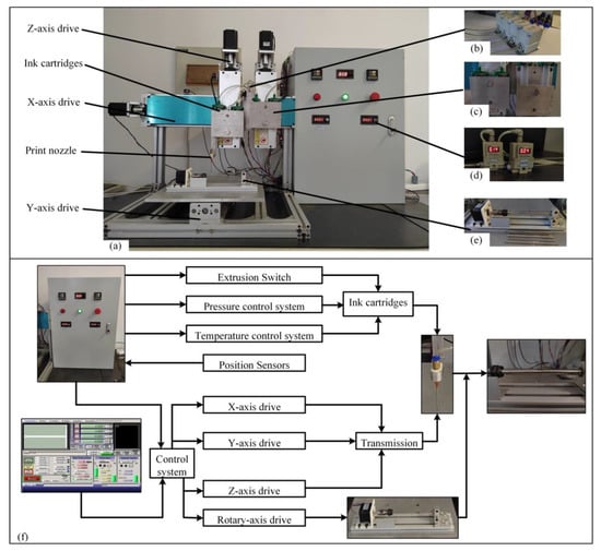 The motion control system consists of an x-axis, y-axis, z1-axis, z2-axis, and c-axis. The printing nozzles are fixed on the two z1-axis and z2-axis, respectively, and the printing platform is fixed on the y-axis. When the bio-printer works, the x-axis and z-axis drive the nozzle movement, and the y-axis drives the printing platform movement to realize the space movement of the printing nozzle on the printing platform. The multi-nozzle extrusion system (Figure 9b) consists of four independent ventilation valves, each of which controls the on and off pressure of the four cartridges. The rotary forming system (Figure 9c) is driven by a stepper motor to rotate the fixture. The clamp can hold the screw rod, and the end of the screw rod is fixed with a rotary thimble to ensure the coaxiality of the blood vessels when printing. The rotary molding system works with the motion control system to print artificial blood vessels of different diameters by replacing different diameters of screw rods. The temperature control system (Figure 9d) consists of a constant temperature plate and a thermostat in which the ink cartridge is embedded. The heating element and temperature sensor in the thermostat plate are connected to the thermostat, which can adjust the real-time temperature at any time so that the biological ink in the cartridge can always maintain the temperature needed for the experiment. The extrusion pressure control system (Figure 9e) controls and adjusts the real-time pressure through an external switch, which can provide a different extrusion pressure for the two groups of nozzles.