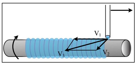 The artificial blood vessel printed at this time was printed by extrusion rotation, as shown in Figure 11. The extrusion material was taken as a reference, and the printing speed, V3, is the synthesis speed of the x-axis feed speed, V1, and the rotation axis speed, V2. The speed formula is as follows: