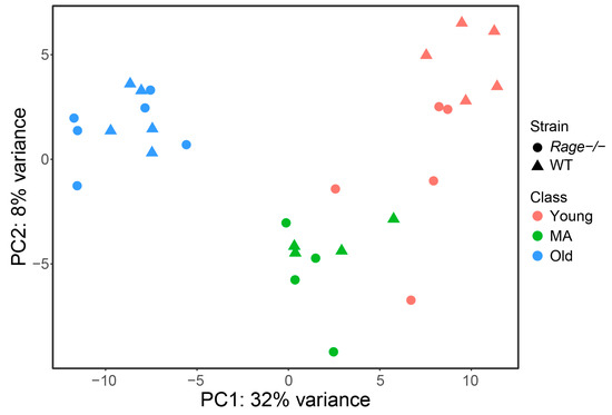 Unsupervised clustering of mice samples by Principal Component Analysis (PCA). A scatterplot of the first 2 principal components (PC1 and PC2) obtained from the PCA was performed using the whole gene-expression dataset. Colors refer to mouse age (red = Young, green = MA, blue = Old); shape represents genotypes (triangles = WT, circles = Rage−/−). WT = Wild Type; MA = Middle Age. Young WT n = 5, Young Rage−/− n = 5, MA WT n = 4, MA Rage−/− n = 4, Old WT n = 5, Old Rage−/− n = 6.