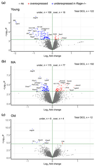Volcano plots. Scatterplots of mean fold changes vs. significance levels (x- and y-axis, respectively) for comparisons of Rage−/− vs. WT in (a) Young, (b) MA and (c) Old mice. Red and blue dots represent significant differentially expressed genes (DEG) that stood adjustment for multiple testing (adjusted p-value < 0.05) and were up- and down-regulated in Rage−/−, respectively. Gray dots refer to non-significant DEG. A horizontal dashed line marks the threshold for -Log10 P corresponding to an adjusted p-Value < 0.05. −Log10 P = −Log10 nominal P-Value; Log2FC = log2 fold changes; WT = Wild Type; MA = Middle Age. Young WT n = 5, Young Rage−/− n = 5, MA WT n = 4, MA Rage−/− n = 4, Old WT n = 5, Old Rage−/− n = 6.