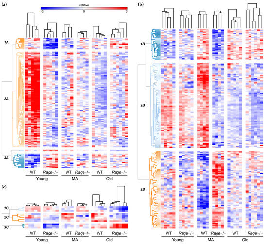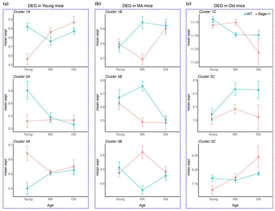 Time-series. The average expression values of the genes constituting each cluster obtained by hierarchical clustering (cf. panels (a) through (c) in Figure 3) were used to draw line plots showing the expression trend of these gene clusters. Panel (a) on the left represents the average expression of gene clusters 1A, 2A, and 3A in Rage−/− vs. WT Young mice. Panel (b) in the center depicts the average expression of gene clusters 1B, 2B, and 3B in Rage−/− vs. WT MA mice, and panel (c) on the right the 1C, 2C, and 3C clusters in Old mice. Pink and light blue lines and dots refer to Rage−/− and WT mice, respectively. Bars represent the standard deviation of the mean expression values between mice of the same age group. WT = Wild Type; MA = Middle Age. Young WT n = 5, Young Rage−/− n = 5, MA WT n = 4, MA Rage−/− n = 4, Old WT n = 5, Old Rage−/− n = 6.