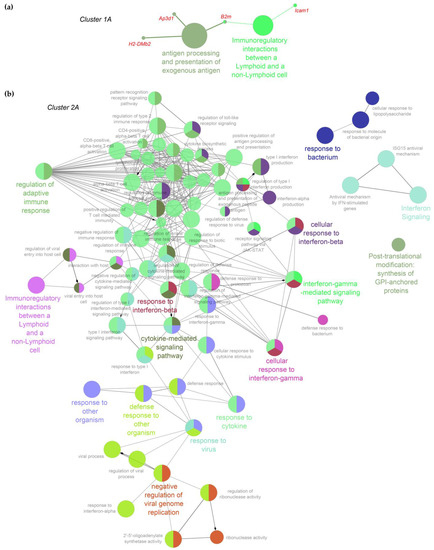 (a) Young. We observed a total of 2, 78, and 17 GO-BP/pathways associated with Cluster 1A, 2A, and 3A, respectively. The most relevant GO-BP/pathways recall mechanisms that involve antigen processing and presentation of exogenous antigen (Cluster 1A), adaptive and innate immune response functions, and cytokine, type I- and gamma-interferon mediated signaling pathways (Cluster 2A). No significant GO-BP/pathways were found in Cluster 3A (for details, see Table S2).