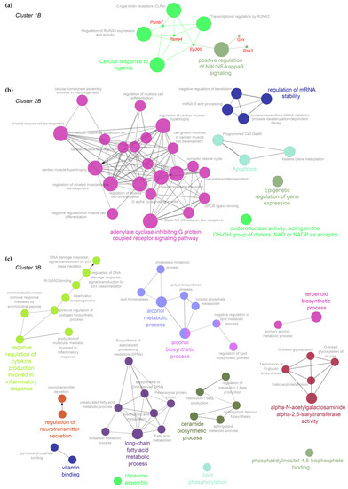 Enrichment networks in Middle Age animals for clusters 1B (a), 2B (b), and 3B (c). The networks show the most significant gene ontology (GO)-biological processes (BPs)/pathways (adjusted p-Value < 0.05) enriched in the transcript clusters identified by hierarchical clustering. Colors refer to groups of gene sets with related biological functions. Node size relates to gene-set significance.