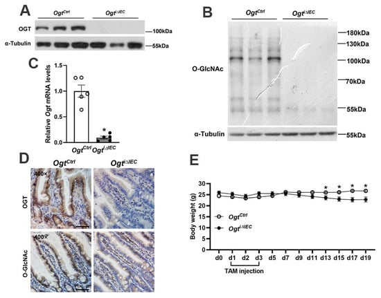 Generation of inducible IEC-specific Ogt knockout mice. The 6–9-week-old male OgtCtrl and Ogti∆IEC mice were subjected to the following assays. (A,B) Western blot analysis of OGT (A) and O-GlcNAcylation (B) in the jejunal IECs. (C) qPCR analysis of Ogt expression in the jejunal IECs (n = 5/group). (D) IHC staining for OGT and O-GlcNAcylation in the jejunum. (E) Body weight was monitored for a period of 20 days (n = 8–9/group). Data are presented as mean ± SEM. * p < 0.05. Scale bars, 50 µm.