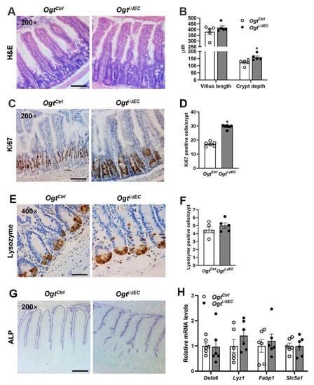 Notably, the small intestine of Ogti∆IEC mice exhibited structural changes during histological analysis (H&E) on day 10 post TAM treatment (Figure 2A). The crypt depth significantly increased by ~30% and the villus also became slightly elongated by ~10% (Figure 2B). Consistent with the enlarged intestinal crypt phenotype, Ki67 immunostaining revealed that Ogti∆IEC mice had more proliferative cells in the crypt than OgtCtrl mice (Figure 2C,D). We previously revealed that Vil-Cre-mediated Ogt knockout resulted in the reduced abundance of Paneth cells in the crypt []. Intriguingly, OgtCtrl and Ogti∆IEC mice had comparable numbers of intestinal Paneth cells, as illustrated by lysozyme immunostaining (Figure 2E,F). Lysozyme-positive Paneth cells in OgtCtrl mice were located at the bottom of the crypt. Surprisingly, Paneth cells in Ogti∆IEC mice were less uniform and not restricted to the bottom of the crypt (Figure 2E). Despite the aberrant location of Paneth cells, the intestinal mRNA levels of Paneth cell marker genes, i.e., Lyz1 and Defa6, were not changed in Ogti∆IEC mice (Figure 2H). Importantly, we found no difference between the OgtCtrl and Ogti∆IEC groups in terms of the intestinal mRNA expression of enterocyte cell markers (Fabp1, Slc5a1) and ALP staining, indicating normal absorptive cell lineage differentiation in the absence of OGT (Figure 2G,H).
