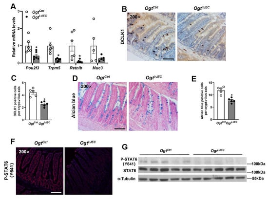 To investigate the functional outcome of Ogt ablation in tuft and goblet cell differentiation in adult mice, we performed qPCR to analyze the mRNA expression of tuft and goblet cell linage markers. Consistent with our previous findings in Vil-Cre-mediated Ogt knockout mice, we found that the expression of tuft (Pou2f3, Trmp5) and goblet (Retnlb, Muc3) cell marker genes was significantly reduced in IECs of Ogti∆IEC mice compared with OgtCtrl mice (Figure 3A). Furthermore, we assessed intestinal tuft and goblet cell abundance by performing DCLK1 immunostaining and Alcian blue staining, respectively. As expected, Ogti∆IEC mice exhibited a significant reduction in the number of tuft and goblet cells, suggesting OGT is required for intestinal tuft and goblet cell differentiation in adult mice (Figure 3B–E). To confirm whether STAT6 activity is impaired in IECs of Ogti∆IEC mice, we performed immunofluorescence and Western blot analyses to detect the STAT6 phosphorylation of tyrosine 641, which is activated by IL-4/IL-13 and is required for its nuclear translocation. Indeed, Ogti∆IEC mice exhibited significantly reduced epithelial STAT6 (Y641) phosphorylation, verifying that STAT6 activity in IECs is compromised in the absence of OGT (Figure 3F,G).
