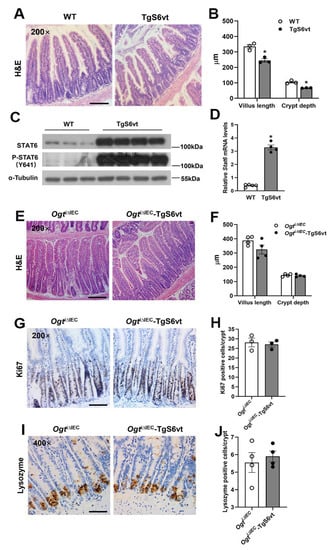 Our previous and current data showed that Ogt deletion in IECs resulted in noticeably reduced STAT6 phosphorylation and activity []. To further explore whether enhanced STAT6 activity rescues the epithelial abnormalities caused by OGT deficiency, we generated a new mouse model with concurrent STAT6 overexpression and Ogt deletion in IECs. We first generated a transgenic mouse model in which a constitutively active form of STAT6 (V547A/T548A, STAT6vt) was expressed under the control of the Vil1 gene promoter, named TgS6vt [,]. As shown in Figure 4A–D, TgS6vt mice exhibited a moderate epithelial expression of transgene STAT6vt (~7-fold increase) and reduced intestinal villus height and crypt depth compared with WT controls. We then crossed TgS6vt mice with Ogti∆IEC mice to produce Ogti∆IEC-TgS6vt mice, which specifically express STAT6vt in IECs with TAM-induced Ogt ablation. Importantly, when the intestinal villus height and crypt depth were measured, we observed a small but not significant decrease in villus height in Ogti∆IEC-TgS6vt mice. However, the crypt depth was comparable between Ogti∆IEC and Ogti∆IEC-TgS6vt groups (Figure 4E,F). Expectedly, Ki67 immunostaining revealed that the number of Ki67-positive proliferative cells in the crypt did not differ between the two genotypes, indicating that the activation of STAT6 in IECs has no effect on crypt cell proliferation in the absence of OGT (Figure 4G,H). In addition, STAT6vt overexpression failed to rescue the aberrant localization of Paneth cells caused by epithelial Ogt deletion, as illustrated by lysozyme immunostaining (Figure 4I,J).