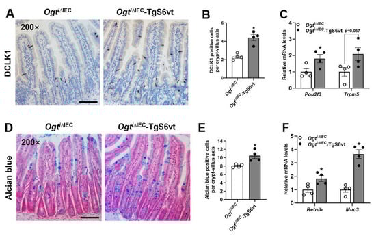 Given that IEC intrinsic STAT6 is sufficient to drive intestinal secretory cell differentiation, we went on to examine whether epithelial STAT6 overexpression rescues the impaired tuft and goblet cell differentiation observed in Ogti∆IEC mice []. Indeed, Ogti∆IEC-TgS6vt mice had more tuft and goblet cells in the small intestine than Ogti∆IEC mice, as illustrated by DCLK1 and Alcian blue staining (Figure 5A,B,D,E). Accordingly, the intestinal expression of marker genes for tuft (Pou2f3, Trpm5) and goblet (Retnlb, Muc3) cells increased substantially in Ogti∆IEC-TgS6vt mice (Figure 5C,F).