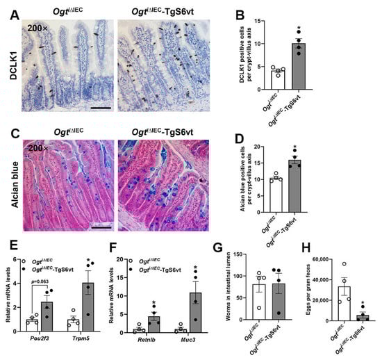Since tuft and goblet cells are key components of type 2 immune responses to helminth infection, we infected Ogti∆IEC and Ogti∆IEC-TgS6vt mice with H. poly, a natural intestinal-dwelling parasitic helminth of mice [,]. Compared with Ogti∆IEC mice, Ogti∆IEC-TgS6vt mice displayed markedly amplified intestinal tuft and goblet cell hyperplasia after H. poly infection, indicating that the activation of IEC STAT6 is sufficient to promote anti-helminth epithelial remodeling in the absence of OGT (Figure 6A–D). These findings were verified by performing qPCR analysis of tuft and goblet cell markers (Figure 6E,F). As a result, although the number of adult H. poly worms colonized in the small intestine was comparable between the two genotypes, Ogti∆IEC-TgS6vt mice passed profoundly less worm eggs into feces than Ogti∆IEC mice, indicating that the overexpression of STAT6 in IECs rescues the impaired helminth expulsion caused by Ogt ablation (Figure 6G,H).