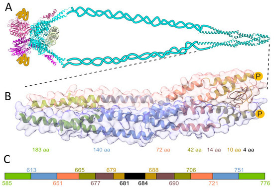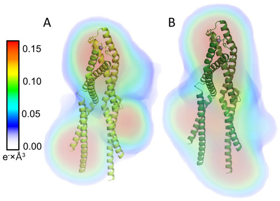 Electron density reconstruction from experimental solution scattering data for (A) HsHk183 and (B) HsHk183 T690E. Electron densities are shown as colored volumes. The color bar on the left indicates the electron density value in e− × Å3. X-ray crystal structure of Rad50 protein fragment is presented in cartoon format (PDB ID 5GOX). HsHk183 and phosphomimetic mutant form rod-shaped particles.
