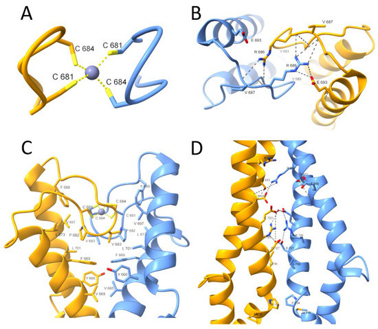 Close-up view of the H. sapiens Rad50 zinc hook domain (PDB: 5GOX) [19]. The presented interfaces stabilize the homodimeric structure of two Rad50 protomers. (A) The first interface is formed by Zn(II) coordination through the conserved CXXC motif. (B) The second interface stabilizes the Rad50 zinc hook domain and consists of ion pair interactions (Arg686-Glu693) and a hydrogen bond (Arg686-Val687). (C) The extensive network of hydrophobic interactions just below the second interface forms the third interface. (D) The last interface is formed at some distance from the rest, and its center is formed at the periphery by hydrophobic interactions and in the center by ionic pairs.