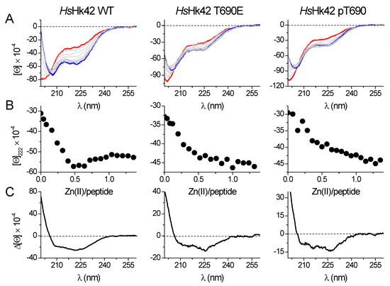 Zn(II) binding to 42-amino-acid long HsHk peptides registered by spectropolarimetry in 20 mM Tris-HCl buffer, pH 7.4, 100 mM NaF. (A) CD spectra of the apo-form of the peptides are shown as a red line, and the complex at a 0.5 molar ratio is shown as a blue line. (B) Molar ellipticity changes measured at 222 nm in the function of Zn(II)/peptide molar ratio. (C) Differential CD spectra for HsHk42 peptides were obtained by subtracting the apo-form spectra from the spectra of complexes at a 0.5 molar ratio. [Θ] corresponds to molar ellipticity in deg × cm2 × dmol−1.