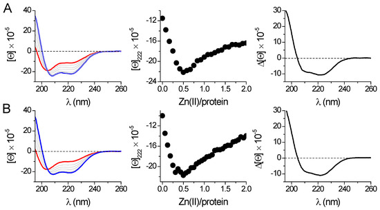 Zn(II) binding to 183-amino-acid-long proteins HsHk183 (A) and HsHk183 T690E (B) was monitored spectropolarimetrically in 20 mM Tris-HCl buffer, pH 7.4, 100 mM NaF. The left panel shows spectra of the apo-form (red line) titrated with Zn(II); the complex at a 0.5 molar ratio is shown as a blue line. The middle panel shows ellipticity changes at 222 nm in the Zn(II)/protein molar ratio function. The right panel presents differential CD spectra for HsHk183 protein fragments obtained by subtraction of the apo-form spectra from the spectra of complexes at a 0.5 molar ratio. [Θ] corresponds to molar ellipticity in deg × cm2 × dmol−1.