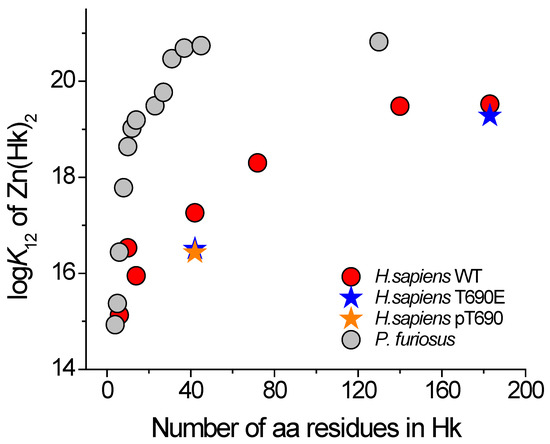 Dependence of conditional formation constants (logK12) of Zn(PfHk)2 (gray circles) and Zn(HsHk)2 (red circles) complexes at pH 7.4 on the length of zinc hook peptides [15,27]. Orange and blue stars correspond to T690E and pT690, respectively.