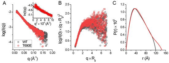 To answer the question of whether phosphomimetic mutation induces conformational changes of HsRad50, we performed a size-exclusion chromatography (SEC)-SAXS experiment. Figure 6A shows the SAXS scattering profile for the proteins. For both proteins, the Kratky plot of the SAXS data shows scattering profiles similar to profiles of partially folded or rod-shaped proteins (Figure 6B) [33]. The HsHk183 and HsHk183 T690E have a similar radius of gyration, 44.584 Å and 45.956 Å, respectively, as well as the maximum dimension of the particle (Dmax) 118.9 Å and 132.1 Å.