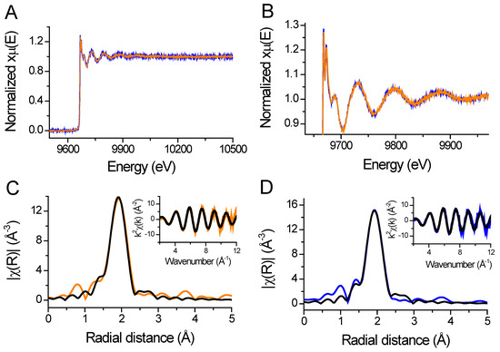XANES is a structural technique that probes the local environment of a metal ion. The X-ray absorption spectrum in the near-edge structure (XANES) is responsive to changes in the coordination mode of the metal ion. Data collected at the K edge of the metal are sensitive to the effective charge and the coordination geometry, while the extended X-ray absorption fine structure (EXAFS) region of the spectrum can inform metal–ligand distances and the number of ligands [36]. We applied both XANES and EXAFS to test to determine whether phosphomimetic mutation at the apex of the zinc hook (HsHk183 T690E) induces local changes in the coordination environment of Zn(II) using HsHk183 as a control. The EXAFS spectra and their corresponding Fourier transforms of HsHk183 and HsHk183 T690E are shown in Figure 8. HsHk183 and HsHk183 T690E X-ray absorption spectra are almost identical (Figure 8A,B), with small differences due to noise. The data for proteins were analyzed in the range of k = 3–12 Å−1, which is typical for peptides or proteins [37]. The Fourier transforms for both samples show a first shell peak at a radial distance of 1.92 Å and smaller outer-shell peaks at a radial distance of 2.3–4.0 Å (Figure 8C,D). Fit to experimental data based on the crystal structure of human Rad50 (PDB 5GOX) [19] explains that the first-shell peak represents the scattering of 4 sulfur, placed ~2.3 Å from Zn(II); additionally, smaller shell features (observed at distances of R = ~3–5 Å) may arise from the single and multiple scattering of atoms such as carbon, nitrogen, and oxygen [36,38] or may be a Fourier transform truncation effect [37]. The results of fitting the EXAFS curve to experimental data are summarized in Table S3. For both proteins (HsHk183 and HsHk183 T690E), the quality of the fits is good (χ2HsHk183 = 45.65 and χ2 HsHk183 T690E = 52.85 with low R-factor values of 7.84 × 10−3 and 8.25 × 10−3, respectively, for HsHk183 and HsHk183 T690E) and explains the observed spectra. Both XANES and EXAFS features confirm that the Zn(II) coordination in protein is tetrathiolate, and phosphomimetic mutation does not influence the local coordination geometry of the Zn(II) in the 183-amino-acid-long Rad50 zinc hook domain.
