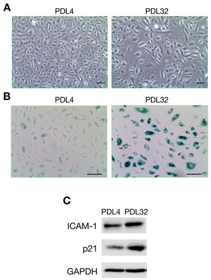 The characteristics of senescent endothelial cells prepared by the serial passage of human umbilical vein endothelial cells (HUVECs). HUVECs were cultured in endothelial cell growth media in 10 cm-diameter dishes and then passaged every 3 or 4 days. (A) Phase contrast images of population doubling level 4 (PDL4) (left) and PDL32 (right) cells are shown. PDL is defined as the total number of times that the cells in the population have doubled. PDL32 cells have an enlarged and flattened morphology (original magnification ×50). (B) Images showing SA-β-Gal staining with PDL4 (left) and PDL32 (right) cells. SA-β-Gal activity is increased in the PDL32 cells (original magnification ×100). (C) The expression of ICAM-1 and p21/WAF-1 in PDL4 and PDL32 cells was evaluated by Western blotting. Images are representative of three independent experiments. Glyceraldehyde 3-phosphate dehydrogenase (GAPDH) expression was detected as an internal control. Scale bars, 100 µm [93].