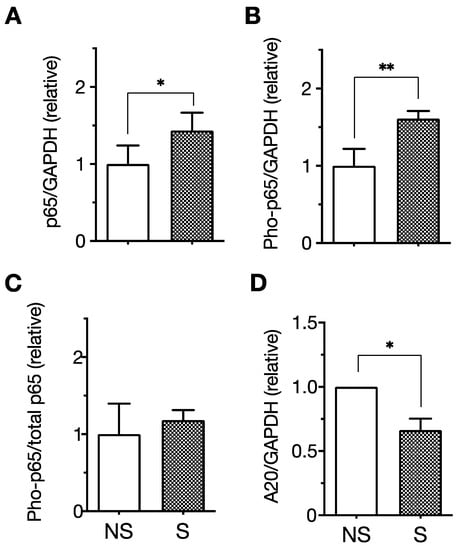 The expression of NF-κB p65 and A20 in senescent endothelial cells. The expression of p65, phosphorylated p65 (Pho-p65), and A20 (a negative regulator of NF-κB) was analyzed with senescent (S) and non-senescent (NS) human umbilical vein endothelial cells (HUVECs) by Western blotting. The relative expression of total p65:GAPDH (A), Pho-p65:GAPDH (B), Pho-p65:total p65 (C), and A20:GAPDH (D) of senescent cells was expressed as a ratio to non-senescent cells. Data are the mean ± standard deviation (SD) of six independent experiments. Values were compared between senescent and non-senescent cells. The expression of total p65 and Pho-p65 was upregulated in senescent cells. In contrast, the expression of A20 was downregulated in senescent cells. * p < 0.05, ** p < 0.01 [93].