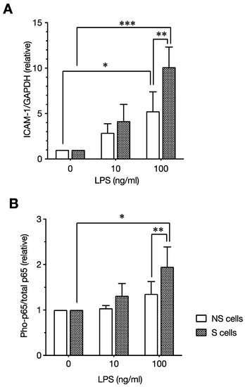 A comparison of the levels of lipopolysaccharide (LPS)-induced ICAM-1 expression and NF-κB p65 phosphorylation in senescent and non-senescent endothelial cells. Senescent and non-senescent human umbilical vein endothelial cells (HUVECs) were incubated with or without LPS (10 or 100 ng/mL) for 24 h, and the expression of ICAM-1, p65, and phosphorylated p65 (Pho-p65) was analyzed by Western blotting. The relative expression of ICAM-1:GAPDH (A) and Pho-p65:total p65 (B) was expressed as a ratio to control cells (0) incubated without LPS in senescent (S) and non-senescent (NS) cells. Data are the mean ± standard deviation (SD) of four independent experiments. Values were compared with (100 ng/mL) and without (0 ng/mL) LPS incubation, as well as between senescent and non-senescent cells incubated with LPS (100 ng/mL). LPS-induced ICAM-1 expression and Pho-p65 level were enhanced in senescent cells. * p < 0.05, ** p < 0.01, and *** p < 0.001 [93].