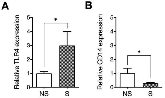 The expression of TLR4 and CD14 in senescent endothelial cells. Flow cytometry was used to analyze the expression of TLR4 and CD14 in senescent (S) and non-senescent (NS) human umbilical vein endothelial cells (HUVECs). The relative expression of TLR4 (A) and CD14 (B) of senescent cells was expressed as a ratio to non-senescent cells. Data are the mean ± standard deviation (SD) of at least three independent experiments. Values were compared between senescent and non-senescent cells. The expression of TLR4 was upregulated, whereas the expression of CD14 was downregulated in senescent cells. * p < 0.05 [93].