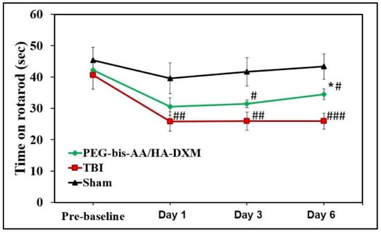 The effect of PEG-bis-AA/HA-DXM treatment on motor function was evaluated by an accelerating rotarod test (4 rpm to 40 rpm over 90 s) at 1, 3, and 6 DPI (Figure 1). The latency time on the rotating rod was significantly different in both the untreated TBI and PEG-bis-AA/HA-DXM animal treatment groups compared to the sham group at all time points. However, we observed that the latency time on the rotating rod was longer in the PEG-bis-AA/HA-DXM-treatment group at all time points and significantly different from the untreated TBI group at 6 DPI.