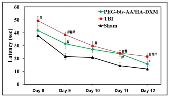 The effect of PEG-bis-AA/HA-DXM treatment on cognitive function was evaluated by a Morris water maze test for spatial learning starting at 8 DPI (Figure 2). Testing consisted of four trials a day for five consecutive days. The time required for the rat to find the hidden platform and stay on the platform for 1 s was recorded as latency time. The latency time in the PEG-bis-AA/HA-DXM-treatment group was shorter than that in the untreated TBI group at all time points and significantly different at 12 DPI (Figure 2). We also observed that the latency time for the PEG-bis-AA/HA-DXM-treatment group was not significantly different from the sham group at 10 and 12 DPI (Figure 2). This result indicates that PEG-bis-AA/HA-DXM treatment improved spatial memory function following TBI.