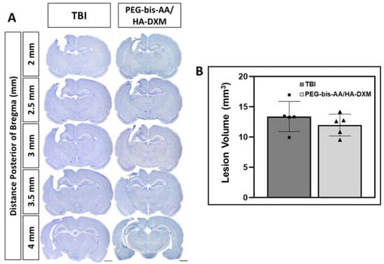 Histological analysis showed that the lesion volume in the PEG-bis-AA/HA-DXM-treatment group decreased compared to that in the untreated TBI group at 14 DPI, but the difference was not statistically significant (Figure 3). This was an unexpected result considering that we observed that the lesion volume was significantly reduced in the PEG-bis-AA/HA-DXM-treated group compared to the untreated TBI group at 7 DPI []. Agoston et al. reported that the edema after injury in rodent TBI reached a peak at 2 DPI and then declined between 7 to 14 DPI []. We assumed that the effects of PEG-bis-AA/HA-DXM on lesion volume may appear more accentuated at 7 DPI when closer to a peak edema rather than at 14 DPI.