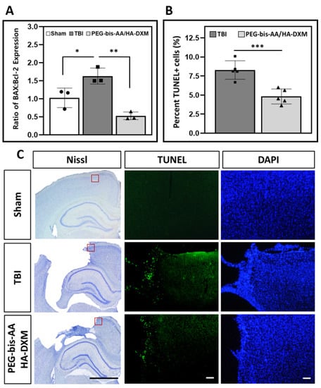 Apoptosis is a key aspect of chronic secondary injury and is worsened by prolonged neuroinflammation. We evaluated the effect of PEG-bis-AA/HA-DXM hydrogels on apoptosis by RT-PCR analysis for gene expression and TUNEL staining for the apoptotic cells (Figure 5). The ratio of gene expression between pro-apoptotic gene BAX and anti-apoptotic gene Bcl-2 is a method frequently used for determining the level of apoptotic activity in cells [,,,,,]. We observed that the ratio of BAX to Bcl-2 expression was significantly reduced in the PEG-bis-AA/HA-DXM group compared to the untreated TBI and sham control groups (Figure 5A). These results are consistent with our previous study using PEG-bis-AA/HA-DXM hydrogels at 7 DPI [] and with similar observations that DX administration can reduce pro-apoptotic BAX gene expression while supporting the expression of anti-apoptotic Bcl2 gene expression [,,,,,]. We also observed that the percentage of TUNEL+ cell nuclei in the perilesional cortex was significantly reduced in the PEG-bis-AA/HA-DXM-treatment group compared to the untreated TBI group (Figure 5B).