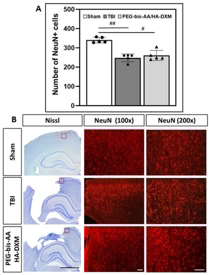 The effect of PEG-bis-AA/HA-DXM treatment on the apoptotic response at 14 DPI. (A) The average number of NeuN+ neuronal nuclei is counted in the image area (total n = 15 sections; n = 3 sections/rat, n = 5 rats/group). Data are presented as mean ± STD. # p < 0.05 and ## p < 0.01 compared with sham. (B) Representative images of immunostaining for NeuN+ neuronal nuclei in the ipsilateral cortex. Images captured in region indicated by the red box in the Nissl-stained brain sections (black scale bar represents 2 mm). White scale bars represent 100 µm.