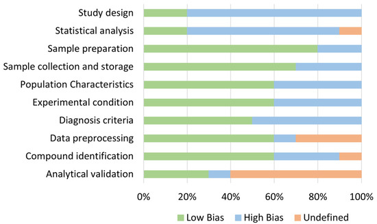 Quality assurance of the studies included was performed, including ten variables for evaluation. The quality assurance results are shown in Figure 2 and Table S3. Variables were based on the experimental methodology. The most reported domains were in sample collection, sample preparation, and experimental conditions, with more than 50% of studies reporting complete information. On the other hand, the least reported domains were in study design, statistical analysis, and analytical validation, where less than half of the studies disclosed some information.