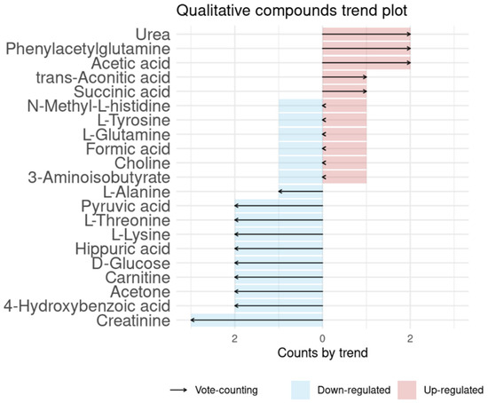 We considered the second group (pre- vs. post-surgery) an analog of the CRC vs. control, as pre-surgery means the patient has CRC, and post-surgery means that the patient is CRC-free. By doing so, there were seventy-four compounds found to be significantly different between case (CRC and advanced adenoma patients) and healthy controls, or by CRC pre-surgery and post-surgery (see Table S7). Of these compounds, fourteen were reported in more than two different cohorts (see Table 3). Some of the Li et al. [25] compounds are reported in the two groups (case-control and pre-/post-surgery), as in their study they did analyze pre-surgery (CRC) vs. controls and pre-surgery vs. post-surgery, so we considered the results for each of the analyses. Vote-counting results are shown in Figure 3. The most repeated compound with the same behavior was creatinine (down-regulated). Three other compounds were reported three times (l-alanine, succinic acid, and trans-aconitic acid) but with different behaviors reported. We identified ten compounds with stable behavior: creatinine, 4-hydroxybenzoic acid, acetone, carnitine, hippuric acid, l-threonine, pyruvic acid (down-regulated), acetic acid, phenylacetylglutamine, and urea (up-regulated).