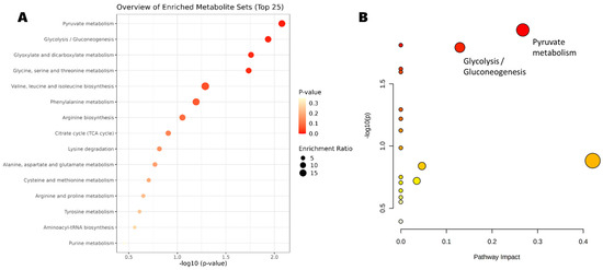 (A) Enrichment and (B) pathways analyses.The x-axis represents the pathway impact value computed from pathway topological analysis, and the y-axis is the-log of the p-value obtained from pathway enrichment analysis. The pathways that were most significantly changed are characterized by both a high-log(p) value and high impact value (top right region). The node color is based on its p-value and the node radius is determined based on their pathway impact values.
