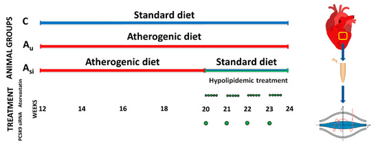 Of these, 13 healthy male three-months-old New Zealand White (NZW) rabbits were randomized into three groups. A control group (C) of 5 animals consisted of NZW rabbits that received a standard chow diet for twelve weeks. The second treated group (Asi) contained 3 NZW rabbits that received a high-fat diet with 0.5% cholesterol and 5% corn oil for the first eight weeks, after which they were switched to a standard diet together with the simultaneous administration of a daily oral dose of atorvastatin (3,5 mg/kg body, 5 days per week) and one weekly IV dose of PCSK9 siRNA-based inhibitor (0.15 mg/kg body) for the following four weeks. The last group of 5 NZW rabbits was the vulnerable atherosclerotic group (Au), which received a high-fat diet with 0.5% cholesterol and 5% corn oil for the entire twelve weeks of animal experimentation. In the end, the heart and both auricular and ventricular blood were collected and stored appropriately for further analysis.