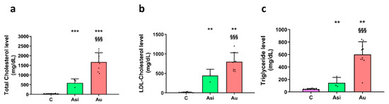 Serological measurements of total cholesterol (a) LDL-cholesterol, (b) triglycerides, (c) from control: C, PCSK9 siRNA and statin-treated hyperlipidemic: Asi and advanced hyperlipidemic: Au samples. The statistical significance over C samples is represented by * (** p < 0.01, *** p < 0.001), while the one over Asi is visible with § (§§§ p < 0.001).
