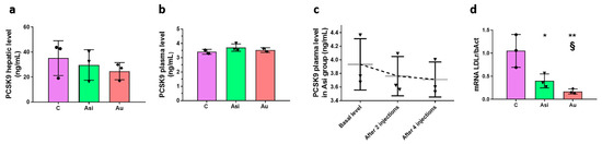 The Asi animals received a combined hypolipidemic treatment for 1 month concomitantly with a standard diet following two months of high-fat intake. We performed specific ELISA assays to determine the PCSK9 absolute level in both the hepatic and plasma samples collected from 3 animals per biological group. Although a small decrease (~15%) in the tissue samples was observed in the Asi group when compared to C, the difference was not statistically significant (Figure 3a). The plasma samples revealed a ~10-fold smaller concentration than the hepatic ones, but, similarly, no significance was discerned between the groups (Figure 3b). When performing a temporal profile of the PCSK9 protein level from the plasma of the Asi animals, a non-significant decrease after 2 and 4 injections, respectively, was revealed when compared to the basal level prior to hypolipidemic treatment administration (Figure 3c). The LDL receptor (LDLr) was also evaluated in the three conditions and we found significantly lower levels in both Asi and Au conditions as opposed to the control one. However, a significantly higher mRNA expression was obtained for the Asi group when compared to the Au group (Figure 3d).