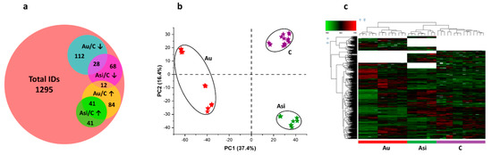 Mass spectrometry inference and relative quantification: (a) Venn intersection of total identifications (IDs) and the differentially abundant proteins in the Asi and Au groups, when normalized to the control values (↑—up-regulated, ↓—down-regulated); Representation of the quantitative profiles using Principal Component Analysis, (b) and Heat Map, (c) of the C (purple color), Asi (green color) and Au samples (red color). Both types of analysis demonstrate a clear distinction between the advanced hyperlipidemic proteomes (Au) as opposed to the PCSK9 siRNA-treated samples (Asi) and the control (C).