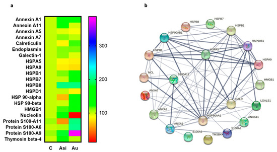 Quantitative and interaction-based profiles of identified alarmins. Heat map representation of identified alarmins (a) and the protein–protein interaction network and (b) using STRING analysis of the molecules (Heat shock proteins A5, A9, B1, B7, B8, 90AA1, 90B1, D1, nucleolin, annexin A7, thymosin β4, S100 A6, A9, and A11 proteins). The heatmap legend shows the normalized scaled-down levels of spectral abundance, while the nodes in the right network are connected using protein–protein associations or edges with confidence levels between 0.150 (low) and 0.900 (highest). All nodes are colored and signify query proteins and the first shell of interactors.