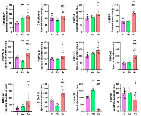 Amongst the analyzed molecules, we identified several regulation tendencies, caused, on the one hand, by the hyperlipidemic diet, and, on the other, by the lipid-lowering treatment. For most of the selected alarmins, the high-fat diet determined an up-regulation of the protein level translated through the mass spectrometric abundance (Figure 7). A significant up-regulation was observed when compared to the control group for HSPB1 (1.3-fold), HSP 90-α (1.4-fold), HSP 90-β (1.2-fold), and HMGB1 (1.4-fold). Significant up-regulation of >1.5-fold over the C sample was demonstrated for annexin A1 (1.8-fold), HSPB7 (1.7-fold), whereas a >2-fold alteration was found for S100 A11 (2-fold), S100 A6 (2-fold), and S100 A9 (3.6-fold). In most of these cases, we registered a non-significant regulation of the alarmin molecules in the Asi group over the C samples, with spectral abundance comparable with that of the C samples (calreticulin, HSPB1, HSPB7, HSP 90-α, HSP 90-β, HMGB1, S100-A6, S100-A9, S100-A11). In other words, a down-regulation trend of these alarmins (compared to the Au group) was observed with the administration of the combined hypolipidemic treatment. On the other hand, we noticed the opposite tendency of nucleolin and HSP60 alarmins, which were under-regulated by the high-fat diet. Of note is that the nucleolin’s spectral abundance was decreased by 7.7-fold over the C group and 12-fold over the Asi group, whereas HSP60 was down-regulated in the Au group.