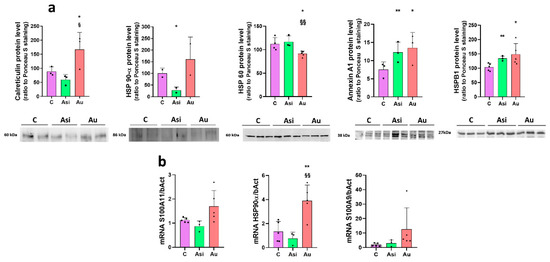 Alternative, immuno-based, and gene expression assays were performed for validation and for further investigation of the mass spectrometry results. We thus performed immunoblot experiments for the validation of calreticulin, HSP 90-α, HSP60, Annexin A1, and HSPB1 alarmins. Calreticulin protein levels presented the same regulation trend as demonstrated by the mass spectrometry results. A non-significant decrease over the C group was observed for the Asi samples, while Au showed the highest protein levels, with significant up-regulation over both the Asi and C sample groups (Figure 8a). A similar alteration tendency was also uncovered for HSP 90-α, where Asi presented an even higher and significant down-regulation over C (3.6-fold), (Figure 8a). HSP 60 regulation was in line with the spectral abundance results, with significant down-regulation caused by the prolonged hyperlipidemic diet over both the control and treated hyperlipidemic samples (Figure 8a). Annexin A1 and HSPB1 Western blotting data demonstrated a significant relative difference between both hyperlipidemic groups over the control one, with non-significant alteration between the first two, a validation of the mass spectrometric results (Figure 8a).