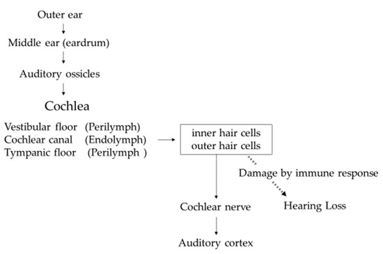- Contribution of systemic circulating antibodies against inner ear antigens leading to antibody-dependent cell-mediated cytotoxicity with the activation of the complement system [40]. For example, IgG4-related disease caused inner ear involvement with cochlear ossification, and the presence of inner ear antibody was previously reported as the cause of inner ear dysfunction [41].