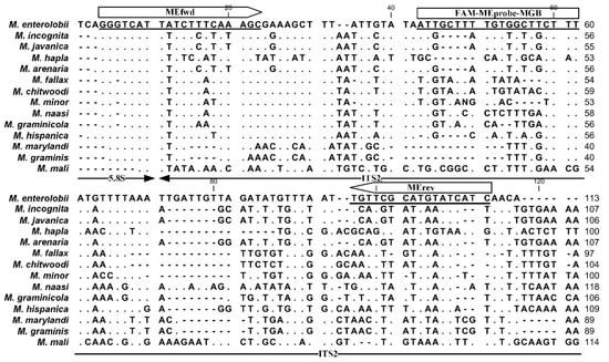 - Zijlstra, C.; Van Hoof, R.A. A multiplex real-time polymerase chain reaction (TaqMan) assay for the simultaneous detection of Meloidogyne chitwoodi and M. fallax. Phytopathology 2006, 96, 1255–1262. [Google Scholar] [CrossRef] [PubMed]
