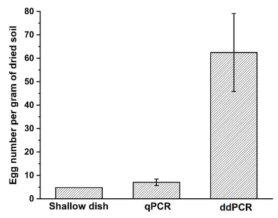 | Eggs in Soil | qPCR (Ct) | ddPCR (Copies·μL−1) | DNA Concentration (fg·μL−1) | qPCR (Ct) | ddPCR (Copies·μL−1) |