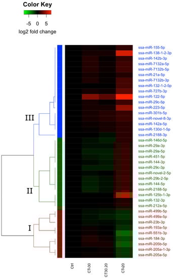 Cluster 1 (I, red letters in Figure 2) consisted of four gDE-miRNAs from three families. The miRNAs in this cluster were all weakly downregulated and upregulated at T1 and T2, respectively, but strongly upregulated at T3. These miRNAs thus displayed a late response to infection. Cluster 2 (II, green letters in Figure 2) consisted of five gDE-miRNAs from four families. The miRNAs in this cluster also showed a late response to infection, but in contrast to cluster 1, showed a substantial downregulation at T3. In contrast, Cluster 3 (III, blue letters in Figure 2) consisted of eight gDE-miRNAs from seven families, which were all strongly upregulated at T1 and slightly less but still strongly upregulated at T3. The gDE-miRNAs in this cluster, thus showed a relatively rapid response to infection despite the pathogen not being detected in HK at this time point.