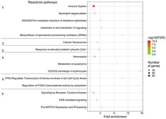 Enriched gene pathways associated with tDE-mRNA genes in head-kidney. The dot size indicates the number of tDE-mRNA genes associated with the process and the dot color indicates the significance of the enrichment (−log10 FDR-corrected p-values). The dot’s position on the Y-axis indicates fold-enrichment compared to the expected occurrence for a random set of genes of that size. The Reactome pathways were subdivided into the following categories indicated by the numbers on the far left: 1. Immune system. 2. Response to Stress. 3. Platelet Activation. 4. Hemostasis. 5. Cell Cycle Control. 6. Receptor Signaling.
