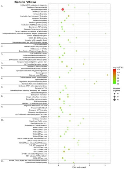 Enriched gene pathways associated with tDE-mRNA genes in lesion sites. The dot size indicates the number of tDE-mRNA genes associated with the process and the dot color indicates the significance of the enrichment (-log10 FDR-corrected p-values). The dot’s position on the Y-axis indicates fold-enrichment compared to the expected occurrence for a random set of genes of that size. The Reactome pathways were subdivided into the following categories indicated by the numbers on the far left: 1. Immune System. 2. Response to Stress. 3. Angiogenesis. 4. Platelet Activation. 5. Energy Metabolism. 6. Metabolism of Amino Acids. 7. Cell Maintenance. 8. Cell Communication. 9. Cell Cycle Control. 10. Receptor Signaling. 11. Neuronal Growth.