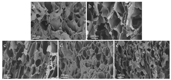 Representative SEM images of (a) SS/CMCS hydrogel, (b) SC450, (c) SC650, (d) SC850, and (e) SC1050.
