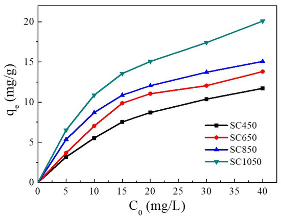 The influence of Cu(II) initial concentration on the adsorption capacity is shown in Figure 2. Increasing Cu(II) initial concentration enhanced the adsorption capacity of Cu(II) on all SC samples. With the Cu(II) initial concentration increasing from 5 mg/L to 40 mg/L, the adsorption capacity of Cu(II) on SC450, SC650, SC850, and SC1050 increased gradually. This result was due to the increase in Cu(II) initial concentration enhancing the driving force of adsorption processes, thus enhancing the removal of Cu(II) ions from the solution [28,29].
