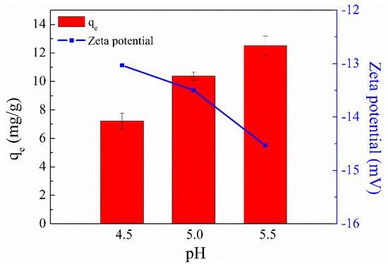 In addition, the zeta potential of SC1050 at pH values of 4.5, 5.0, and 5.5 was measured to explore its adsorption mechanism. Figure 3 shows that a solution pH of 5.5 made the surface charge of SC1050 more negative, increasing the ionic strength between SC1050 and the positively charged Cu(II) ions, which made the adsorption more effective. Therefore, a pH of 5.5 was selected for subsequent adsorption experiments.