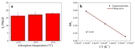 (a) Effect of temperature on Cu(II) adsorption onto SC1050 and (b) a van’t Hoff plot for adsorption of Cu(II) onto SC1050 (Cu(II) initial concentration = 15 mg/L, pH = 5.5, contact time = 24 h).